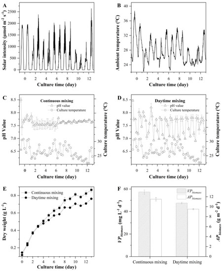 Solar intensity (A), ambient temperature (B), pH values and culture temperature (C,D), biomass concentration (E), and volumetric and areal biomass productivities (F) of T. aequale grown in 5.2 m2 M-ORP operated in a continuous mixing regime and a daytime mixing one. Each treatment had two biological replicates. The experiment was carried out from 31 July to 13 August 2019.