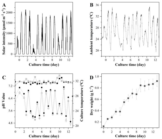 Solar intensity (A), ambient temperature (B), culture pH and temperature (C), and biomass concentration (D) of T. aequale grown in two outdoor 52 m2 L-ORP (L-ORP-1 and L-ORP-2) (filled square, hollow square, filled cycle, and hollow cycle represent pH values of L-ORP-1 and L-ORP-2, culture temperatures of L-ORP-1 and L-ORP-2, respectively). The experiment was carried out from 16–29 August 2019.