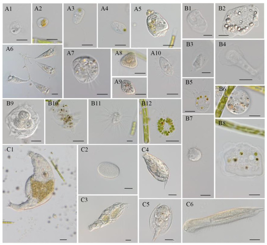 Protozoa and zooplankton occurred in T. aequale cultures outdoors, which were classified into three categories: flagellates and ciliates (A), amoeba (B), and rotifers and metazoans (C). (A1,A2): Poterioochromonas sp.; (A3,A4): flagellates (unknown); (A5): Vorticella convallaria; (A6): Epistylis sp.; (A7): Aspidisca sp.; (A8): Suctorian sp.; (A9): Colpoda sp.; (A10): Cyclidium sp. (scale bar: (A1–A4, A7, and A10) = 10 μm; (A5, A6, A8, and A9) = 20 μm). (B1–B4, B8, and B9): Vannella sp.; (B5 and B12): Nuclearia sp.; (B6 and B10): unknown amoeba; (B7 and B11): Heliozoa sp. (scale bar: (B1 and B3) = 5 μm; (B2, B5–B9, B11, and B12) = 10 μm; (B4 and B11) = 20 μm); (C1): Philodina sp.; (C2): Rotifer egg; (C3): Lecane inermis; (C4): Monostyla sp.; (C5): Lepadella patella; (C6): Chaetonotus sp. (scale bar = 20 μm).