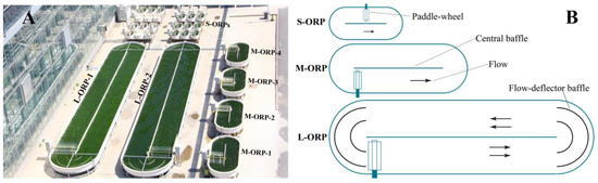 Cultivation of T. aequale SAG200.80 in ORP outdoors was carried out at the SDIC Microalgal Biotechnology Center Testbed facility (Yanjiao, China; 39°96′ N, 116°82′ E) from July through September 2019. Three sizes of ORPs were employed, and they were small-size ORP (S-ORP) with an illuminated surface area of 0.5652 m2, medium-size ORP measuring a surface area of 5.2 m2, and large-size ORP of 52 m2 (Figure 8). A general procedure of preparation of microalgal inoculum, a Tribonema culture in glass columns, was scaled up to a 12 L flat panel photobioreactor, then to a 380 L tubular photobioreactor, and finally to a 1500 L tubular photobioreactor.