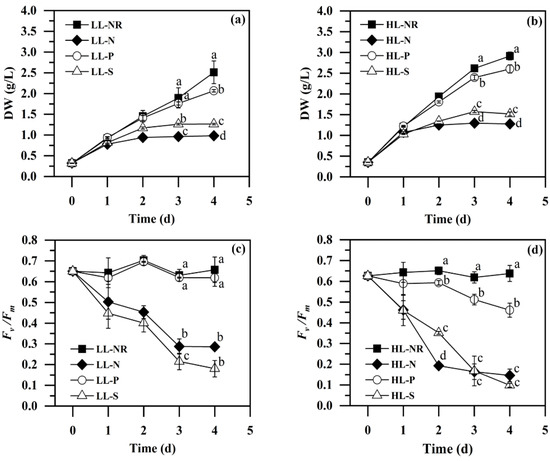 - Cakmak, T.; Angun, P.; Demiray, Y.E.; Ozkan, A.D.; Elibol, Z.; Tekinay, T. Differential effects of nitrogen and sulfur deprivation on growth and biodiesel feedstock production of Chlamydomonas reinhardtii. Biotechnol. Bioeng. 2012, 109, 1947–1957. [Google Scholar] [CrossRef]