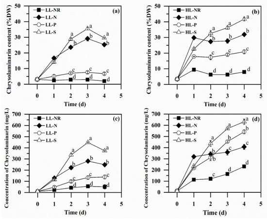 | Chrysolaminarin content (pg/cell) | 3.48 ± 0.69 d | 40.97 ± 1.90 b | 8.95 ± 0.84 c | 45.31 ± 1.30 a | 8.71 ± 0.09 d | 40.58 ± 1.21 b | 23.10 ± 1.56 c | 50.72 ± 1.50 a |