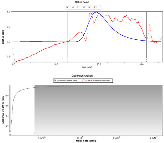 Molecular weight chromatogram of polysaccharides derived from the seaweed Enteromorpha prolifera using gel permeation chromatography (GPC). LS, light scattering; UV, ultraviolet spectroscopy, dRI, differential refraction.
