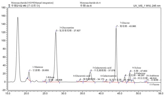 The monosaccharide composition of SDP was measured using HPLC. An Agilent 1200 HPLC system (Palo Alto, CA, USA) coupled with a SHISEIDO C18 column (250 mm × 4.6 mm, Palo Alto, CA, USA) was used. Monosaccharide standards, including those for Man, Rib, Rha, Fuc, GlcN, Xyl, Ara, Gal, GalN, Glc, GalA, and GlcA, were obtained commercially (Sigma-Aldrich chemical Co. Milwaukee, WI, USA). Analytical procedures were based on previous study [78].