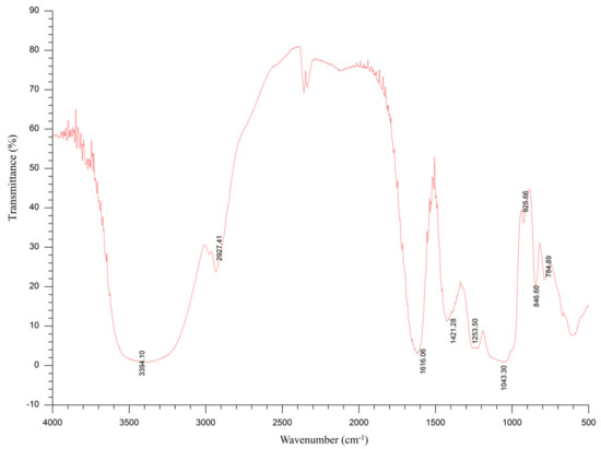 The FT-IR spectra of SDP are shown in Figure 3. The absorption trough of wave at 3600–3200 cm−1 (the trough point is 3394 cm−1) is the characteristic of sugars, and the trough in this range represents -OH stretching vibrations. Furthermore, the absorption trough at 2927 cm−1 is assigned to C-H stretching vibrations. The absorption trough at 1616 cm−1 is attributed to the crystal water. An absorption trough can be seen at 1421 cm−1, which is assigned to the stretching vibration of C-O. The absorption troughs at 1253 cm−1 and 1043 cm−1 are the variable angle vibration of -OH. The absorption trough at 925 cm−1 represents the pyran ring stretching vibration. The absorption trough at 846 cm−1 is attributed to the C-H variable angle vibration of the α-terminal epimerization of the pyran ring.