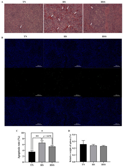 Histology (A), cell apoptosis (B,C), and relative weight of spleens (D) subjected to heat stress and after treatment with dietary seaweed-derived polysaccharides. * p < 0.05, ** p < 0.01, no superscript marks indicated that p > 0.10. TN, thermoneutral zone; HS, heat stress; HSS, HS group supplemented with 1000 mg/kg seaweed-derived polysaccharides. Scale bars of histology (A), 400× are 25 μm and scale bars of cell apoptosis (B), 200× are 100 μm. Arrows (A), indicated that the infiltration of inflammatory cells, cell death, and destruction of the cell structure.