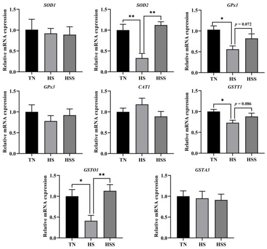 Splenic relative mRNA expression of antioxidant enzyme-related genes after being subjected to heat stress and treatment with dietary seaweed-derived polysaccharides. * p < 0.05, ** p < 0.01, no superscript marks indicated that p > 0.10. TN, thermoneutral zone; HS, heat stress; HSS, HS group supplemented with 1000 mg/kg seaweed-derived polysaccharides. The abbreviations for the detected parameters (SOD, CAT, GPx, GSTT, GSTA and GSTO) are superoxide dismutase; catalase; glutathione peroxidase; glutathione S-transferase theta; glutathione S-transferase alpha and glutathione S-transferase omega, respectively.