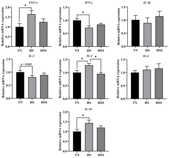 The cytokine levels of the spleen are shown in Table 4. The HS group had higher splenic tumor necrosis factors (TNF)-α, interleukin (IL)-4, and IL-10 concentrations, and lower splenic interferon (INF)-γ and IL-2 concentrations compared with the TN group (p < 0.05). In contrast, SDP supplementation decreased TNF-α, IL-4, and IL-10 levels and increased IL-2 levels in the spleen from the HS group (p < 0.05). As indicated in Figure 6, the HS group exhibited lower IFN-γ mRNA expression (p < 0.05). HS exposure increased TNF-α, IL-4, and IL-10 mRNA expression in the spleen compared with those in the TN group (p < 0.05). In contrast, dietary supplementation with SDP reduced splenic IL-4 mRNA expression (p < 0.05).
