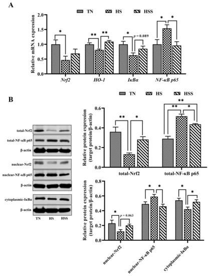 mRNA and protein expression of molecules related to Nrf2 and NF-κB signaling pathways (A) after subjecting to heat stress and treatment with dietary seaweed-derived polysaccharides. * p < 0.05, ** p < 0.01, no superscript marks indicated that p > 0.10. The abbreviations for the detected parameters (Nrf2, HO-1, IκBα and NF-κB p65) (B) are nuclear factor erythroid 2-related factor 2; heme oxygenase-1; inhibitor kappa B alpha, and nuclear factor-kappa B p65, respectively.