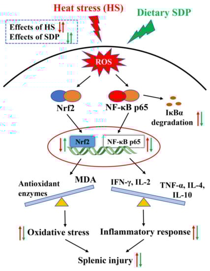 Proposed model of dietary inclusion of seaweed-derived polysaccharides attenuating heat stress–induced splenic oxidative stress and inflammatory response. SDP, seaweed-derived polysaccharides; ROS, reactive oxygen species; IκBα, inhibitor kappa B alpha; Nrf2, nuclear factor erythroid 2-related factor 2; NF-κB p65, nuclear factor-kappa B p65; MDA, malondialdehyde; TNF-α, tumor necrosis factor-α; IFN-γ, interferon-γ; IL interleukin.