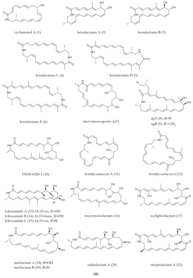 | 18–19 | mirilactams A/B | Mono-ring | 26 | Micromonospora sp. RL09-050-HVF,Actinosynnema mirum | Marine | Lack of anti-trypanosomal activity | Natural screening and isolation | [10,29] |