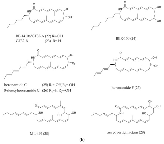 Microorganisms have a remarkable capacity for producing a wide range of unique bioactive secondary metabolites. A substantial number of them have developed into a supply of lead medicines, diagnostic reagents and biological probes. Among diverse microorganisms, Streptomyces and Micromonospora in the Actinomycetes family showed great potential in the discovery of drug leads or drug candidates. For instance, Streptomyces, a Gram-positive bacteria, is a rich reservoir of natural products [1,2], including anthraquinone (e.g., adriamycin), lactones (e.g., rapamycin), flavonoids (e.g., O-methylated phenylpropanoids) [3] and so on. Micromonospora, a genus of Micromonosporaceae, witnessed the recent growth of new actinomycetes-derived compounds, such as macrolides, spirotetronates, ansa-macrolides, angucycline, non-ribosomal peptide synthase (NPRS), PKS-NRPS hybrids and terpenes [2]. Both the two genera of bacteria are the main producers of polyene macrolactams (PMLs), which is a relatively small but growing family. PMLs exhibited a large spectrum of bioactivities such as antimicrobial (bombyxamycin A-C (11,12,42) [4], BE-14106 (22) [5] and ML449 (28) [6], antifungal (auroramycin (37) [7]), antitumor (vicenistatin (32) [8] and leinamycin (48) [9]) and anti-parasitic activities (lobosamides (13–15) [10] and sagamilactam (73) [11]), modulation of Bcl-xl function (incednine (35) [12]) and anti-inflammatory properties (cyclamenol A (1) [13]) (Table 1). Some typical PMLs compounds such as hitachimycin (49), BE-14106 (22), sceliphrolactam (17), heronamides (25–27, 62–72), cremimycin (80) and macrotermycins (30–31,76,79) produced by Streptomyces sp. had impressive antifungal properties.