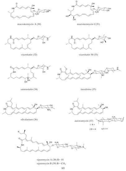 With the development of resistance to azoles [14,15,16], amphotericin B [17] is often considered the last defensive line for life-threatening fungal infections but its application is limited because of its high cytotoxicity. In the clinic, most antifungal agents target ergosterol biosynthetic pathways with only a few showing no relation to ergosterol targets [18]. It is encouraging that some PMLs with antifungal abilities have a unique antifungal mechanism. Although Alvarez R. et al. reviewed bio and chemical synthetic pathways of PMLs, there are only a few comprehensive reviews on PMLs [19]. Here, we provided an updated review on the structural classification, microbial sources, production strategies, biosynthetic pathways and bioactivities of PMLs. The remaining challenges and future opportunities are also discussed.