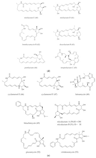 The structure of PMLs is characterized by a ubiquitous 16–34 membered lactam ring with numerous double bonds. Hydrophilic groups, particularly the amide groups, are located in the closed ring of the carbon skeleton. There must be at least three olefinic bonds on the primary carbon skeleton. Five distinctive secondary structural features, including a ring with hydroxyl and methyl groups, the hydrophobic structure with hydrocarbon chains and a possible linkage to a glycoside, intramolecular epoxidation and intramolecular polycyclic structure. Despite the resources of PMLs being diverse (marine, sea island, forest soil, insects and plants), the marine-derived PMLs are gradually increasing in recent years, indicating that the marine environment is a non-negligible space for PMLs mining. According to the features of the PMLs’ structures from 1972 to 2021, we classified them into two major groups, mono- and polycyclic, and then subdivide them into smaller branches that contain aliphatic chains, sugar groups and epoxidation groups. Among all PMLs, polycyclic tetramate macrolactams (PTMs) are different from others in the initial pathway, so they were classified as a separate branch in the polycyclic group. The detailed information on PMLs’ structures, bioactivities and producers was shown in Figure 1a–e, Figure 2a–e and Figure 3a,b) and Table 1.