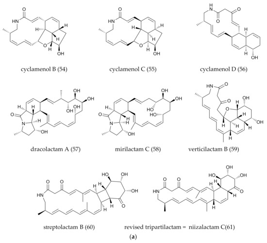 - Hoshino, S.; Okada, M.; Wakimoto, T.; Zhang, H.; Hayashi, F.; Onaka, H.; Abe, I. Niizalactams A-C, Multicyclic Macrolactams Isolated from Combined Culture of Streptomyces with Mycolic Acid-Containing Bacterium. J. Nat. Prod. 2015, 78, 3011–3017. [Google Scholar] [CrossRef] [PubMed]