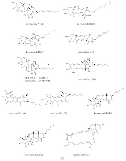 Interestingly, mirilactams C–E (58, 40–41) and a series of typical intramolecular polycyclic compounds produced by Streptomyces in pure culture did not show any antimicrobial activities. Heronamides (25–27, 62–72) and heronamide C (25) showed notable morphologically reversible non-cytotoxic effects on mammalian cells. Deoxyheronamide C also displayed cell membrane-associated bioactivities. Apart from the above two compounds from the family of heronamides, no other heronamides exhibited cytotoxicity and antibacterial activity [35,37,52,83]. These results do not conform with the rules of nature due to the fact that bacteria produced these useless compounds involving large metabolic costs in terms of energy and nutrients. By using Hes1-immobilized beads, iso-micromonolactam was a possible activator of neural stem cells, implying the potentially latent function of PMLs [84]. The underlying cause of this phenomenon deserves an in-depth investigation chemically and biologically in the future.