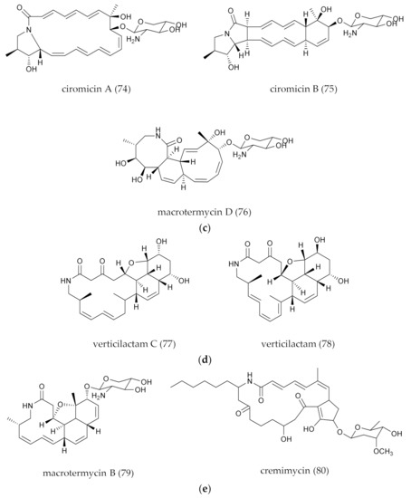 - Igarashi, M.; Tsuchida, T.; Kinoshita, N.; Kamijima, M.; Sawa, R.; Sawa, T.; Naganawa, H.; Hamada, M.; Takeuchi, T.; Yamazaki, K.; et al. Cremimycin, a novel 19-membered macrocyclic lactam antibiotic, from Streptomyces sp. J. Antibiot. 1998, 51, 123–129. [Google Scholar] [CrossRef] [PubMed]