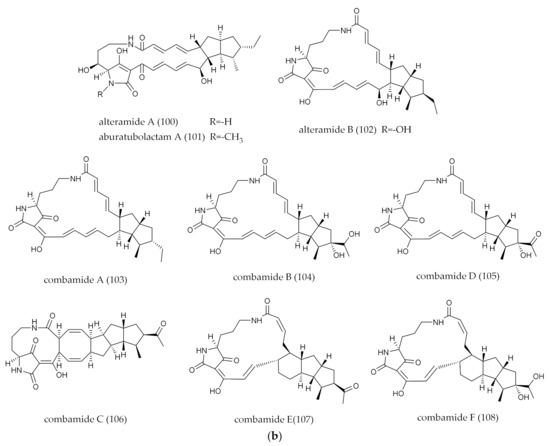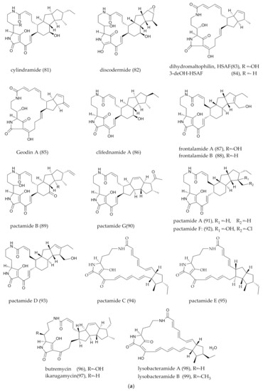 (a) Polycyclic tetramate macrolactams (PTMs), a branch of polycyclic PMLs. (b) Polycyclic tetramate macrolactams (PTMs), a branch of polycyclic PMLs.