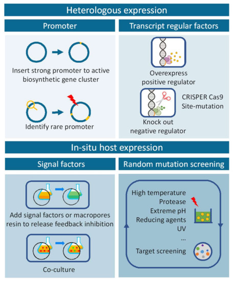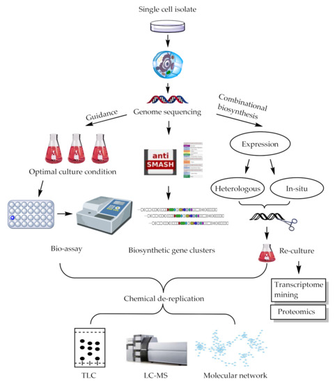 For years, scientists devoted considerable efforts to the discovery of novel bioactive compounds in the hope of finding drug leads or drug candidates. However, the frequent rediscovery of known natural compounds has become increasingly common and chemists squandered far too much attention on repetitive screening. Seeking new microorganisms for a new type of chemical scaffolds has proven to be effective [72,73]. In addition to genomic mining for microorganism de-replication, chemical informatics methods are also critical. Moreover, scientists have developed several combinatorial biosynthetic techniques to combine with complicated metabolic networks, largely in Streptomyces, obtaining a variety of natural compounds, including PMLs. A schematic of these strategies was shown in Figure 4.