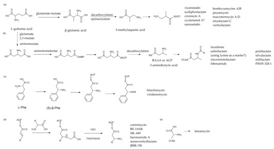- Miyanaga, A.; Kudo, F.; Eguchi, T. Mechanisms of β-amino acid incorporation in polyketide macrolactam biosynthesis. Curr. Opin. Chem. Biol. 2016, 35, 58–64. [Google Scholar] [CrossRef]