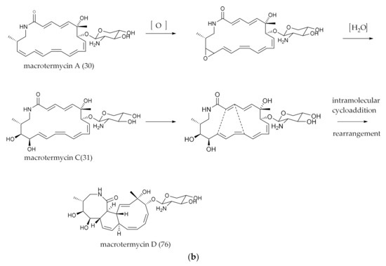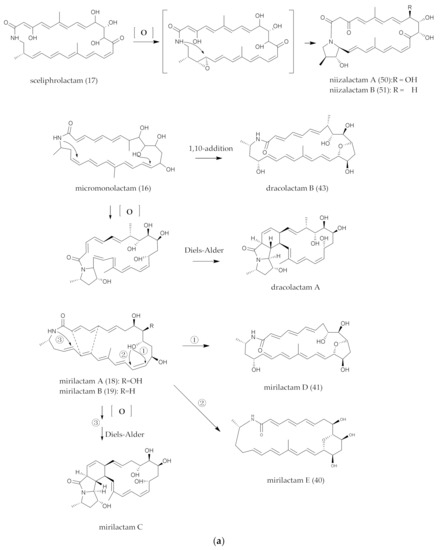 - Booth, T.J.; Alt, S.; Capon, R.J.; Wilkinson, B. Synchronous intramolecular cycloadditions of the polyene macrolactam polyketide heronamide C. Chem. Commun. 2016, 52, 6383–6386. [Google Scholar] [CrossRef]
