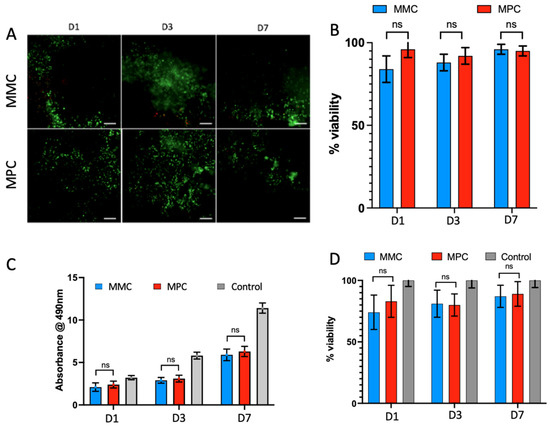 Cell viability of encapsulated L929 fibroblasts in crosslinked MMC and MPC collagen hydrogels. (A) Representative images of bioscaffolds stained with live/dead (calcein AM, ethidium homodimer-1) at the 3 different indicated time points (D1, 3 and 7). Scale bar is 100 µm. (B) The graph shows the cell viability obtained from the live/dead stained samples, calculated as the percentage of live: dead cells. (C) The graph shows the metabolic activity of the cells in the bioprinted scaffolds evaluated with MTS assay and absorbance readings at 490 nm. (D) Cell viability calculated from MTS assay, normalised to standard curve of 2D cultured cells. Results of the t-test indicate no significant difference between MMC and MPC at each timepoint in both the calcein-AM and ethidium homodimer-1 staining, as well as the MTS assay. ns: No statistical significance was observed between MMC and MPC at each timepoint.