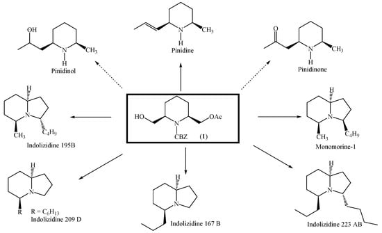 (−)-Gephyrotoxin-223 (indolizidine 223 AB) (Figure 1) is one of the 3,5-disubstituted indolizidines and belongs to a large group of simple bicyclic alkaloids []. Ghodsi et al. performed the formal asymmetric synthesis of (−)-gephyrotoxin-223 via enzymatic desymmetrization []. The key synthesis intermediate was chiral synthon [(+)-(2R,6S)-monoacetate/(−)-(2S,6R)-monoacetate] (1), which was prepared by enzymatic hydrolysis and enzymatic acetylation in the presence of Aspergillus niger lipase (ANL). Using chiral synthon as the starting material, the alkaloid ((−)-gephyrotoxin-223) was achieved in good yield. Of note, the chiral synthon (1) obtained by the enzymatic reactions could be used as a chiral building block in the enantioselective synthesis of a series of piperidine alkaloids (Figure 1).