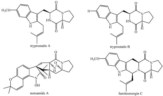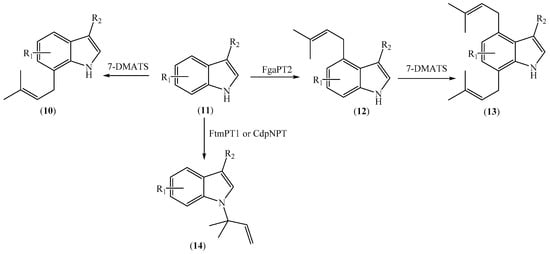 Prenylated indole alkaloids are natural products that are mainly produced by marine organisms, especially in the genera Penicillium and Aspergillus of ascomycota. For example, brevicompanine G was isolated from deep ocean sediment-derived Penicillium sp. [], representing a large group of compounds that contain indole and isoprenoid moieties with diverse biological and pharmaceutical activity. A number of prenylated indole alkaloids or/and their derivatives have been found to exhibit cytotoxicity. For example, tryprostatins A and B (Figure 2), as well as their diastereomers, have shown better cytotoxicity against various cancer cell lines than etoposide [,,]. In addition, notoamide A (Figure 2) was found to exhibit moderate cytotoxicity toward HeLa and L1210 cells [], and tryprostatins A and fumitremorgin C (Figure 2) were reported to be active inhibitors of the ABC transporter and breast cancer resistance protein, respectively []. Moreover, both compounds could reverse the resistance of some tumor cell lines []. Hinnuliquinone and semicochliodinols A and B were also found to inhibit HIV-1 protease []. Over the past decade, the biosynthesis of prenylated indole alkaloids has been well demonstrated by molecular biological and biochemical characterization, as summarized by several excellent reviews [,]. Significant progress has also been achieved in the chemoenzymatic synthesis of prenylated indole alkaloids. Although many prenylated indole alkaloids are derivatives of the same amino acids, the differences in prenylation position and manner represent large structural diversity within the prenylated indole alkaloids. Thus, the key steps for the chemoenzymatic synthesis of prenylated indole alkaloids have focused on the prenyl transfer reactions catalyzed by prenyltransferases. Scheme 3 shows one example of chemoenzymatic synthesis of prenylated simple indole derivatives (10, 12, 13, 14) using prenyltransferases. The same indole derivate (11) was used as a substrate for mono-prenylation using prenyltransferases FtmPT1 or CdpNPT, FgaPT2, and 7-DMATS. Diprenylated indole was produced using FgaPT2, and 7-DMATS by tandem incubation, while cyclic dipeptide containing one tryptophan was used as the substrate to produce prenylated derivatives using CdpNPT, AnaPT, FgaPT2, and 7-DMATS []. Notably, many derivatives with different indole positions have been obtained using the abovementioned strategy [].