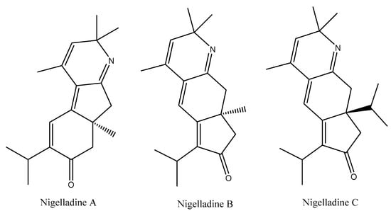 Marine-derived alkaloids possess potent pharmacological activity. For example, one imidazole alkaloid, paenidigyamycin A, which was isolated from Ghanaian Paenibacillus sp. DE2SH showed significantly high antiparasitic activity of IC50 0.75 µM, making it just as effective as amphotericin B (IC50 0.31 µM) []. Shang et al. showed that C19-aconitine diterpenoid alkaloids, isolated from Aconitum carmichaelii, had a significant effect on the analgesic activity of mice when administered in acetic acid at a dose of 0.5 mg/kg of body weight [,]. C20-vakognavine diterpenoid alkaloids have been shown to exert noticeable anti-inflammatory activity nearly equal to aspirin; thus, they may be a potential aspirin alternative [,]. Angustilongines have shown strong anticancer cytotoxicity against various human cancer cell lines with excellent IC50 values ranging from 0.02 to 9.0 µM [,].
