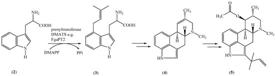 Marine-derived fungi of genera Claviceps, Penicillium, and Aspergillus will produce different secondary metabolites, including fumigaclavine C (5) (Scheme 1) [,], an ergot alkaloid of the clavine type. All ergot alkaloids possess diverse biological and pharmacological activities. Steffan et al. performed chemoenzymatic synthesis of prenylated indole derivatives, with fumigaclavine C (5) as the best example, by using 4-dimethylallyltryptophan synthase from Aspergillus fumigatus (Scheme 1). In addition, 4-prenylated indole derivatives and 7-prenylated indole derivatives were produced, using aromatic prenyltransferases, by FgaPT2 and DMATS as biocatalysts, respectively. Significantly, to conduct these chemoenzymatic reactions, the authors also used 10 different substrates from tryptophan derivatives and tryptophan-containing cyclic dipeptides, and different conversion rates were obtained [,,].