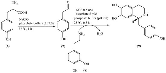 (S)-Norcoclaurine (9) (Scheme 2) is a benzylisoquinolinealkaloid. Benzylisoquinoline alkaloids possess diverse biological activities and are widely employed as pharmaceuticals. In fact, (S)-norcoclaurine is currently considered one of the best β1-adrenergic drugs in its class, with a pharmacokinetic profile that favorably competes with dobutamine []. Because dobutamine is currently marketed as a racemic mixture, it is particularly important for achieving enantioselective (S)-norcoclaurine. Nevertheless, the availability of natural (S)-norcoclaurine from marine/terrestrial sources is still very limited; thus, the development of a synthetic strategy using cheaper and cleaner synthetic routes is urgently needed. Bonamore et al. developed an efficient, stereoselective, green synthetic route for (S)-norcoclaurine using the recombinant (S)-norcoclaurine synthase (NCS) enzyme (Scheme 2). Inexpensive tyrosine (6) and dopamine (8) were used as the starting materials to prepare (S)-norcoclaurine using the green Pictet–Spengler reaction. First, tyrosine underwent oxidative decarboxylation to produce 4-hydroxyphenylacetadehyde (7) []. Then, dopamine and NCS with ascorbate were added to avoid oxidation and to afford the desired (S)-norcoclaurine using a one-pot, two-step process. Under the optimized reaction conditions, (S)-norcoclaurine was obtained with a yield greater than 80% and with an ee value of 93%. Furthermore, the enzyme could be recycled and maintain its excellent activity and stability. These results represented an example of a chemoenzymatic synthetic strategy for (S)-norcoclaurine production, which could open up a novel, efficient, and green strategy for benzylisoquinoline alkaloid production.