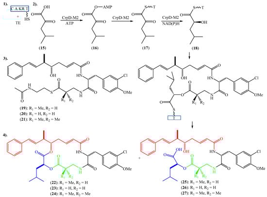 Chemosynthetic route relying on the multifunctional enzyme CrpD-M2 to cryptophycins. (19): unit ABC mono; (20): unit ABC non; (21): unit ABC di; (22): cryptophycin 3; (23): cryptophycin 24; (24): cryptophycin 51; (25): seco-cryptophycin 3; (26): seco-cryptophycin 24; (27): seco-cryptophycin 51. Units A (red), B (dard), C (green), and D (blue).