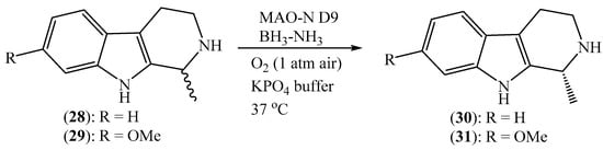Many of the marine natural products commonly used in modern medicine are chiral compounds. Because enantiomerically pure compounds have received significant interest in academia and industry, the development of synthetic strategies for optically pure chiral natural products has become an important topic in preparative organic chemistry. One common way to prepare chiral compounds in an enantiomerically pure form involves the conventional kinetic resolution of racemic compounds using chemical catalysts or lipases []. However, using this strategy, the desired enantiomer could be obtained with a maximum theoretical yield of 50%, which would significantly reduce the efficiency of this process, especially in situations where the starting materials were derived from natural sources, or where their synthesis required a multistep route. Significant progress has been made in the application of biocatalysts (except for lipases) for the synthesis of chiral amines based on deracemization. For example, transaminase, ammonia lyase, amine dehydrogenase, imine reductase, and amine oxidase have been used for the industrial synthesis of chiral amine []. As amines, marine-derived alkaloid natural products typically exhibit interesting biological activities; thus, the application of biocatalysts for the deracemization of racemic alkaloids has received significant attention to afford enantiomerically pure compounds. For example, Ghislieri et al. demonstrated the use of monoamine oxidase variants from Aspergillus niger (MAO-N D9) for the deracemization of marine-derived (±)-eleagnine (28) and (±)-leptaflorine (29) to their corresponding enantiomerically alkaloid natural products (Scheme 5) []. (R)-Eleagnine (30) in 99% ee was accumulated after repeated cycles, and it underwent the oxidation of (S)-coniine and nonselective chemical reduction of imine with BH3−NH3 in the following step. (R)-Eleagnine (30) was obtained with a yield of 93%, while (R)-leptaflorine (31) (in 99% ee) was afforded with a yield of 99% using the same strategy.
