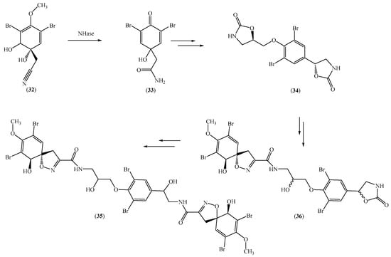 Lipowicz et al. isolated nitrile hydratase (Nhase) from the Mediterranean sponge Aplysina cavernicola and converted nitrile aeroplysinin-1 (32) to dienone amide verongiaquinol. Dienone amide verongiaquinol originated from the brominated isoxazoline alkaloids, which were secondary metabolites of the marine sponge. Therefore, these results indicated the chemoenzymatic synthesis of marine-derived alkaloids (Scheme 6) []. Aplysina cavernicola uses NHase enzyme as a chemical defense, compared to other NHase compounds. Thus, the hydration of the nitrile group from aeroplysinin-1 (32) into dienone amide (33) occurred when NHase catalyzed this reaction. This enzyme not only converted nitrile into amides but also eliminated the hydroxyl group from aeroplysinin-1 (32). The elimination of the hydroxyl group created a double bond in the product, and the enzymes also generated an oxo function in dienone amide by demethylating the methoxy substituent. Of note, a series of compounds structurally related to aeroplysinin-1 were tested using the studied Nhase, and none were accepted by the enzyme. The fact that the tested analogues, except for aeroplysinin-1, did not bind to the studied Nhase suggested that the enzyme had very strict substrate specificity. Thus, the application of this strategy for the transformation of other closely related alkaloids may be limited. Remarkably, this synthetic strategy benefited from the high stability of the enzyme, as the optimum pH and temperature were found to be 8.0 and 41 °C, respectively. The effects of different metal ions on enzymatic activity were also described []. Manganese was shown to be the best ion capable of restoring enzymatic activity, while cobalt and nickel ions were relatively less effective. Zinc, copper, and iron ions had no effect on enzymatic activity.