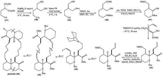 Petrosins were first isolated by Braekman et al. from the extract of marine sponge Petrosia seriata []. Petrosins are bisquinolizidine alkaloids; therefore, they belong to the studied marine-derived alkaloids. Petrosins have been found to exhibit anti-HIV activity, as they can actively inhibit the formation of syncytinum and reverse transcriptase []. Further evaluation of petrosin biological activity showed that petrosins significantly prevented the HIV from binding to human cells. For this reason, the development of a synthetic strategy to provide a large amount of petrosins and the creation of new analogues with modified/improved biological activity have been important research topics in the field of organic chemistry. Toya et al. accomplished total synthesis of (−)- and (+)-petrosins with lipase-mediated desymmetrization of 1,3-diol as the key step (Scheme 7) []. The chemoenzymatic preparation of the bisquinolizidine alkaloid, (−)- and (+)-petrosin, was achieved by using several steps. The reduction of known compound (37) afforded 1,3-diol (38), which was converted to an enantiomerically pure form after lipase-mediated desymmetrization. Protection from the remaining hydroxyl group followed by hydrolysis gave carbamate (40), and Swern oxidation of carbamate (40) gave the corresponding product (41) in quantitative yield. The desired ester was obtained by the diastereoselective Mannich reaction. After a sequence of organic reactions, the final products, (−)-petrosin and (+)-petrosin (46), were obtained in 95% ee and 96% ee, respectively. Except for lipase-mediated desymmetrization, the diastereoselective Mannich reaction was an essential step in stereocontrolling the quinolizidine ring. A series of bispiperidine derivatives were also synthesized using the same strategy.