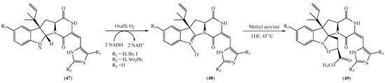Indole alkaloids are well-known marine-derived natural products due to their interesting biological activity and complex chemical structures. Indolic nitrones, such as avrainvillamide, waikialoid, and roquefortine L, comprise a rarely observed group of indole alkaloids, because they feature a triazaspirocyclic skeleton derived from an unusual rearrangement of the kiketopiperazine core []. Nevertheless, indolic nitrones possess potent properties including antibacterial, anticancer, antiparasitic, and insecticidal activities. For example, avrainvillamide was shown to exhibit promising antiproliferative activity, and the proposed mechanism was that the nitrone functional group was nucleophilically attacked by cystein residues in the cellular proteins []. For this reason, the chemical synthesis of marine-derived indolic nitrones has become an interesting research topic. Chemical conversion of indolines into their respective nitrones is still a challenge, as the reaction requires either mild oxidative conditions or a multistep procedure. Alternatively, the enzymatic production of nitrone-functionalized indolines would considerably benefit from its mild reaction conditions and a single high-yield step. Newmister et al. described the single-step biocatalytic conversion of roquefortine C (47) and roquefortine C semisynthetic derivatives for the production of corresponding cycloadduct indoline alkaloids (49) (Scheme 8) []. The OxaD enzyme was an indolic nitrone synthase, which was isolated from a marine-derived fungus Penicillium oxalicum F30. The desired final products (indoline nitrones) were isolated in pure form with a satisfactory yield after silica gel chromatography. This work illustrated a good example of a biocatalytic synthesis of indoline nitrones, offering a number of applications in chemistry and chemical biology.
