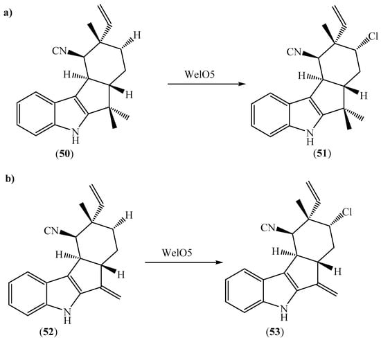 Hapalindole-type indole alkaloids are a diverse class of marine natural products with widespread use in modern (agro)chemical, pharmaceutical, and fine chemical industries. The presence of a halogen substituent in the hapalindole-type indole alkaloids plays a vital role in its biological activity, electronic properties, and metabolic stability []. Therefore, the development of a synthetic transformation for hapalindole-type alkaloids has been a long-sought goal. The generation of aliphatic carbon–halogen bonds in natural alkaloids requires chemo-, regio-, and stereoselective control of the inert sp3-carbon centers. As a result, the chemical synthesis of hapalindole-type indole alkaloids has not yet been achieved. Remarkably, aliphatic halogenases are promising biocatalysts for the halogenation of inactivated aliphatic carbons []. Zhu et al. described the application of standalone aliphatic halogenases to introduce bromine instead of chlorine substituents into the family of natural products. The Fe/2OG halogenase WelO5 could convert 12-epi-fischerindole U (50) and 12-epi-hapalindole C (52) to 12-epi-fischerindole G (51) and 12-epi-hapalindole E (53) with a very good yield in a single step (Scheme 9) []. The incorporation of a halogen substituent at the C-13 of 50 afforded the corresponding hapalindole-type indole alkaloid (51), resulting in significantly enhanced antibiotic activity toward human bacterial and fungal pathogens. This work highlighted the versatility of WelO5 as a halogenase for the production of hapalindole-type indole alkaloids, as well as expanded the application of WelO5 as a biocatalyst and a useful tool for modern medicinal chemistry.