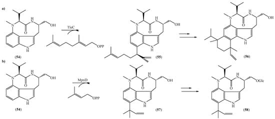 Prenylation reactions catalyzed by prenyltransferases play crucial roles in controlling biomolecular activity, including indole alkaloids. Different enzymes have been used to catalyze the prenylation of different positions in the indole ring. Prenylation reactions can be divided into two types, namely, normal prenylation and reverse prenylation [], where normal prenylation indicates that prenylation occurs at the C-1 primary center, while reverse prenylation occurs at the C-3 tertiary center. Mori et al. described the chemoenzymatic synthesis of indole alkaloids lyngbyatoxin A and pendolmycin by using indole prenyltransferases TleC and MpnD, respectively (Scheme 10) []. TleC from Streptomyces blastmyceticus was a 42 kDa protein consisting of 391 amino acids, while MpnD from the deep sea Marinactinospora thermotolerans was a protein that shared 38% identity with TleC. Both TleC and MpnD catalyzed the reverse prenylation reactions of the cyclic dipeptide (−)-indolactamV (54) at the C-7 position of the indole ring, affording lyngbyatoxin A (55) and pendolmycin (57), respectively. The substrate specificities of TleC and MpnD were also investigated by incubating the purified enzymes with several indole derivatives and prenyl pyrophosphates of various chain lengths. The experimental results illustrated that TleC and MpnD had relaxed substrate specificity toward the prenyl donors, but strict substrate specificity toward the prenyl acceptors. Therefore, a series of unnatural indolactam derivatives with improved/modified biological activity could be produced by TleC and MpnD using the same reverse prenylation strategy.