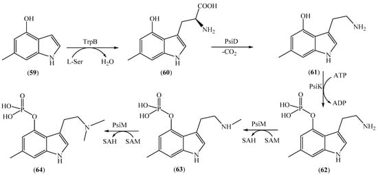 Psilocybin belongs to a class of indole alkaloids, possessing a unique 4-phosphoryloxy group. Psilocybin is of pharmaceutical interest, as it has been used to treat end-of-life anxiety and depression in advanced clinical trials []. Significant progress has been achieved in the chemical synthesis of psilocybin. For example, Yamada et al. successfully synthesized various derivatives containing 6-phosphoryloxy and 6-hydroxyisomers of psilocybin []. However, the synthesis of 6-methylated psilocybin is still beyond the capability of existing approaches. A comparison between 6-methylated psilocybin and psilocybin bioactivity showed that no significant differences were observed in the treatment of end-of-life anxiety and therapy refractory depression. Therefore, Fricke et al. described the enzymatic synthesis of 6-methylated psilocybin, to provide a strategy for gram-scale production and to provide sufficient psilocybin in vitro, specifically for comparative in vivo assays []. 4-Hydroxy-6-methylindole (59) was used as the starting material and was converted to 4-hydroxy-6-methyl-L-tryptophan (60) using tryptophan synthase P. cubensis TrpB (Scheme 11). Subsequently, compound (60) was used as the co-substrate for a one-pot reaction using recombinant enzymes PsiM, PsiD, and PsiK, which catalyzed N-methylation (6-methylbaeocystin 63), decarboxylation (4-hydroxy-6methyltryptamine 61), and phosphorylation (6-methylnorbaeocystin 62), respectively. In addition, 6-methylated psilocybin (64) was obtained in two enzymatic steps with 75% yield. This work provided a completely new strategy for the synthesis of alkaloids and their derivatives.