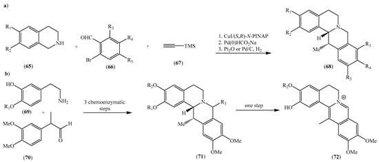 Tetrahydroprotoberberine and protoberberine are unique alkaloids from marine-derived natural products, as they possess a methyl group at the C-13 position. Notably, 13-methyltetrahydroprotoberberine (13-Me-THPB) and 13-methylprotoberberine (13-Me-PB) alkaloids are biologically active []. For example, they were shown to be dopamine D-1 receptor agonists and exhibit anti-hepatitis B and inhibitory activity against reverse transcriptase and enterovirus 71. Isolation from marine sources has typically resulted in low production and separation issues, with regard to structurally closed metabolites. Significant progress has been made in the chemical synthesis of 13-Me THPB and 13-Me-PB alkaloids, although most cases can afford the final products in racemic form. For example, Zhou et al. described the asymmetric synthesis of 12 natural 13-Me-THPBs (58) in three steps, with an overall yield of 47–65% []. This approach used a chiral ligand (an enantiopure PINAP ligand) to accomplish the stereoselective synthesis of 13-Me-THPBs with 91–96% ee (Scheme 12a). Roddan et al. demonstrated chemoenzymatic cascades toward 13-Me-THPB and 13-Me-PB using stereoselective Pictet–Spenglerase, regioselective catechol O-methyltransferases, and selective chemical Pictet–Spengler reactions (Scheme 12b) []. This approach had notable advantages, including subsequent reactions and no requirements for workup isolation of any synthetic intermediates. The 13-Me-THPB and 13-Me-PB alkaloids were obtained with 99% yield and 96% ee. Remarkably, the obtained 13-Me-THPB alkaloids had a (−)-configuration, which was novel compared to the naturally occurring (+)-isomeralkaloids.