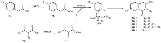 Quinolizinones are important marine-derived alkaloids due to their interesting bioactivity. For example, they are active inhibitors of HIV integrase and phosphoinositide-3-kinase (PI3K), and they exhibit anti-ulcerative and antiallergic activity []. For this reason, the development of a synthetic strategy for quinolizinones has been interesting. Numerous studies concerning the chemical synthesis of quinolizinones have been reported; however, most are not cost-effective or multistep, and they require harsh reaction conditions [,]. Wang et al. synthesized representative quinolizinones, denoted as 2-hydroxy-4H-quinolizin-4-one, scaffolds by integrating three enzymes (Scheme 13) []. PcPCL (a phenylacetate-CoA ligase from an endophytic fungus Penicillium chrysogenum), which catalyzed the conversion of 2-(pyridine-2-yl)acetic acids (73) to the corresponding CoA thioester (74). In addition, AtMatB (a malonyl-CoA synthase from Arabidopsis thaliana) catalyzed the conversion of malonic acids (75) into malonyl-CoAs (76). Subsequently, 2-pyridylacetyl-CoA (74) and malonyl-CoA (76) underwent condensation, generating a diketide intermediate by a type III PKS. This intermediate (77) suffered from intramolecular cyclization, producing quinolizinone scaffolds (78–82). This work may provide an entirely new approach to the enzymatic synthesis of pharmaceutically important alkaloids.
