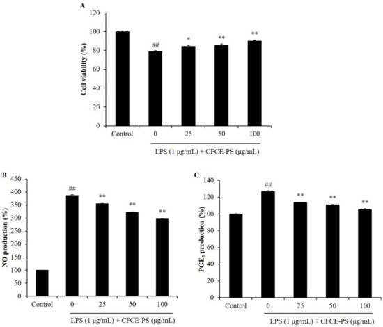 RAW 264.7 macrophages (RAW 264.7 cells, TIB-71TM) were purchased from ATCC (Manassas, WV, USA). Cells were seeded in a 24-well plate (1 × 105 cells/mL) for 24 h. The cells were treated with 25, 50, and 100 µg/mL CFCE-PS. The cells non-treated with CFCE-PS and LPS are referred to as the control group. CFCE-PS-treated cells were incubated for 1 h and the plate was replaced with the media containing 1 µg/mL LPS. After 24 h incubation, the viability of LPS-treated RAW264.7 cells was measured using an MTT assay, and the production of NO was determined using a Griess assay [28].