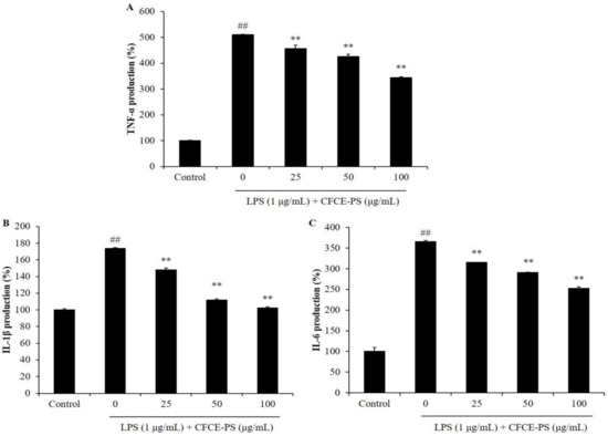 Effect of CFCE-PS on the production of pro-inflammatory cytokines in LPS-stimulated RAW 264.7 cells. (A) Production of TNF-α; (B) production of IL-1β; and (C) production of IL-6. The cells non-treated with CFCE-PS and LPS are referred to as the control group. The experiments were conducted in triplicate and the data are expressed as mean ± SE. ** p < 0.01 as compared to LPS-stimulated group and ## p < 0.01 as compared to control group.