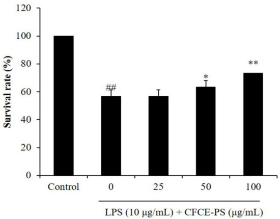 Survival rate of zebrafish after being treated with CFCE-PS or/and with LPS. The zebrafish non-treated with CFCE-PS and LPS are referred to as the control group. The experiments were conducted in triplicate and the data are expressed as the mean ± SE. * p < 0.05, ** p < 0.01 as compared to the LPS-stimulated group and ## p < 0.01 as compared to the control group.