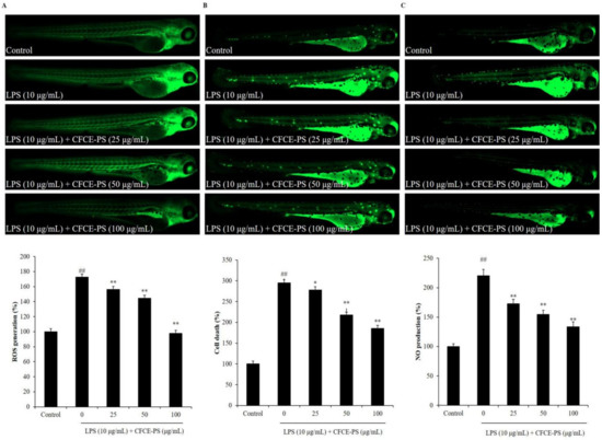 Effect of CFCE-PS on inflammatory responses in LPS-induced zebrafish. (A) ROS level of LPS-stimulated zebrafish; (B) cell death of LPS-stimulated zebrafish; and (C) NO production in LPS-stimulated zebrafish. The zebrafish non-treated with CFCE-PS and LPS are referred to as the control group. The relative amounts of ROS, cell death, and NO of zebrafish were measured using ImageJ software. The experiments were conducted in triplicate and the data are expressed as the mean ± SE. * p < 0.05, ** p < 0.01 as compared to the LPS-treated group and ## p < 0.01 as compared to control group.