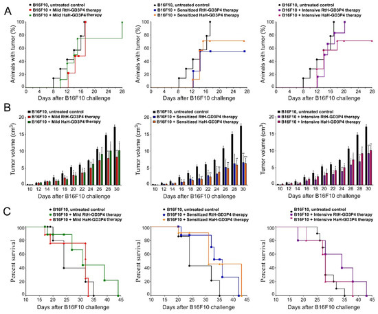 Tumor incidence, tumor growth, and survival analyses in different experimental groups (n = 10 mice each) in B16F10 mouse melanoma model. The dynamics of tumor incidence (A), tumor growth (B), and survival curves (C) of experimental B16F10-challenged animals under three different therapeutic approaches with RtH-GD3P4 or HaH-GD3P4 were monitored and compared to controls (untreated B16F10-injected mice). The data are presented as mean ± SD and the p-values are calculated using the two-way ANOVA test (* p < 0.05; ** p < 0.01; *** p < 0.001) in comparison to B16F10-bearing mice.