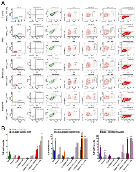 Quantitative analysis of the tumor microenvironment was performed by FACS for all B16F10 cells inoculated animals to evaluate the effect of vaccination with RtH-GD3P4 and HaH-GD3P4 using the different approaches of administration. Different tumor-infiltrated lymphocytes were detected following immunization with both vaccines, compared to the untreated tumor-bearing controls (Figure 3). Significant differences were found in the specific cell populations in the sensitized groups pretreated with RtH-GD3P4 or HaH-GD3P4. An increased number of B lymphocytes, CD4+, CD8+ T cells, and NK cells in early maturation stage (CD27+CD11b-) and mature stage (CD27+CD11b+) was found in the group treated with HaH-GD3P4, while higher levels of activated CD8+ and early mature and mature NK cells were observed in mice immunized with RtH-GD3P4 compared to control animals (Figure 3B, middle panel). In contrast, a huge content of CD4, CD8, and CD19 lymphocytes and early mature and mature NK cells was found among the tumor-infiltrated immune cells after immunization of RtH-GD3P4 following the intensive scheme of administration, which correlates with the strong inhibition of the tumor growth (Figure 3B, right panel). An increased number of CD4, CD8 T cells, CD19, and early mature and mature NK cells was found in both groups mildly treated with RtH-GD3P4 or HaH-GD3P4 vaccines, while the percentage of activated CD8 T lymphocytes as well as the macrophages remained unchanged compared to untreated tumor-bearing mice (Figure 3B, left panel).