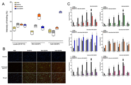 Induction of humoral immune response against B16F10 cells. (A) Anti-tumor antibodies in B16F10-challenged animals under the intensive scheme with RtH-GD3P4 or HaH-GD3P4 were measured by Dot blot assay compared to controls. The recognition of B16F10 cell lysate from IgG antibodies is presented as an intensity of binding (%) using Image J software. (B) Indirect immunofluorescence analysis. The fixed B16F10 cells were incubated with mouse sera from sensitized therapy-treated animal groups (dilution 1:25) followed by anti-mouse IgG-FITC antibody and Hoechst 33342 staining. Magnification 20×. (C) ELISpot assay for evaluation of vaccines’ therapy. Isolated mouse splenocytes from all experimental animals were exploited for counting of anti-B16F10 IgG antibody-secreting plasma cells. The number of spots in the test-wells corresponding to B16F10-specific plasma cells was compared to untreated B16F10-bearing controls. All samples (A,C) were triplicated, and mean ± SD values were presented for each group; p values were calculated using the two-way ANOVA test. (* p < 0.05; ** p < 0.01; *** p < 0.001). A representative of three independent experiments is shown.