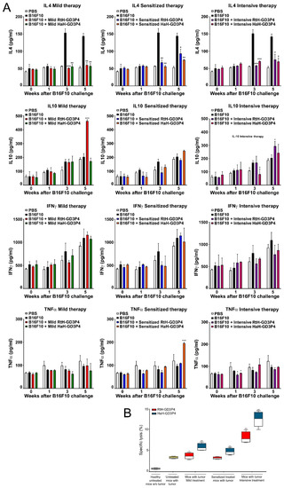 The serum levels of IL4, IL10, IFNγ, and TNFα were measured weekly in C56B6 mice sera from all experimental groups using quantitative ELISA (Figure 5A). The treatment with both vaccines under all regimens of therapy resulted in significantly lower IL4 production in all measured points compared to control tumor-bearing group. The same therapy did not lead to significant differences in IFNγ values between the test groups. The mice under the mild and intensive regimen of treatment with RtH-GD3P4 produced significantly higher serum levels of IL10 at the end point of observation (5th week) compared to the control and HaH-GD3P4 treated groups. It was not observed for the sensitized therapy RtH-GD3P4 group, but weak increase of the same cytokine was measured in the sensitized therapy HaH-GD3P4 group at the end point of observation.
