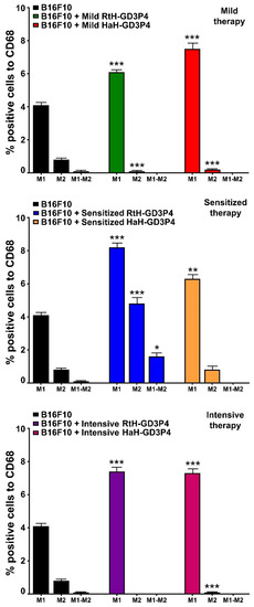 The administration of RtH-GD3P4 or HaH-GD3P4 to experimental animals generates significantly higher levels of tumor-infiltrated M1 macrophages, compared to tumor-bearing control mice (Figure 6). Low numbers of M2 macrophages in the solid tumors were counted in both vaccine-treated groups under mild and intensive schemes of immunization, while elevated levels were detected in both sensitized therapy-treated groups. An increased level of double positive (CD86+/CD163+) M1-M2 macrophages was found in the RtH-GD3P4 sensitized therapy treated group.